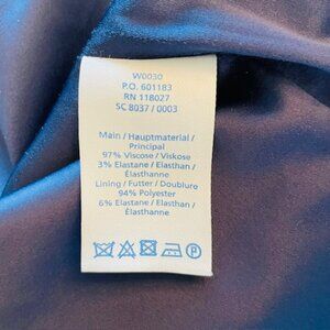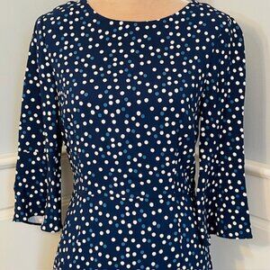 Business or Semi Formal Sheath Dress from Boden. Light stretch sheath style with 3/4 flutter sleeves. Fully lined, hidden back zip, darted bust, fitted waist, jewel neck. Navy blue with blue and white polka dots. Chic Formal Dress. Professional, Perfect For Work or special occasion. Versatile.