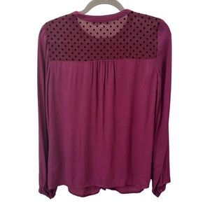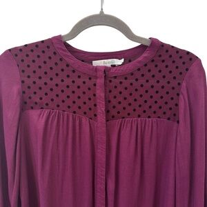 A fun, quirky button-up blouse with sheet polka dot detail on the top. In great condition with no flaws, stains, or holes.