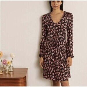 Boden Dress Medium Black Pink Floral Long Sleeve Preppy Classic V Neck Stretch