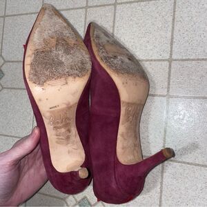 Chic burgundy heels with a striking red bow. Ideal for elevating any outfit.