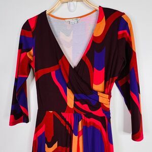 Add some flair to your wardrobe with this stunning Boden Elena Knit Fixed Wrap Long Sleeve V Neck Dress in size 4! Featuring a colorful geometric pattern and a knee-length hemline, this dress is perfect for any occasion. The wrap style and v-neckline flatter your figure while the long sleeves provide warmth during cooler weather. Made from soft viscose knit fabric, this dress is both comfortable and stylish. Get ready to turn heads in this must-have addition to your closet!