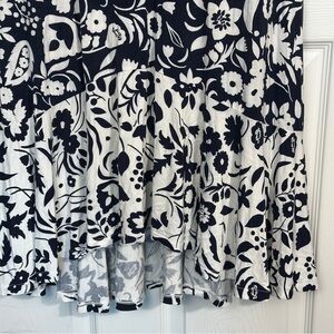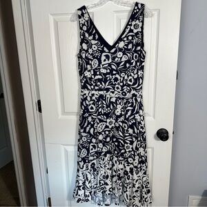 Boden "Elisa" jersey dress in size 10. Blue and white, changing to white and blue near the hem. Slight high/low hemline, fully lined, double V neck (both front and back). 93% viscose/7% elastane.