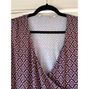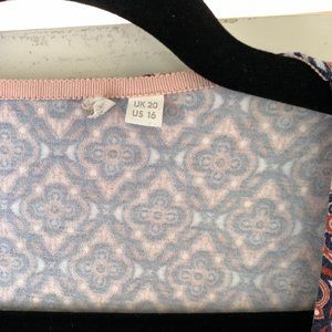 Color: "Conker, Ornate Tile" -- a print made up of orange, dark blue, and white, which overall looks burgundy-ish.