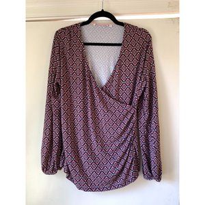 Knit fabric with a faux-wrap front that's ruched along the side. Long sleeves that have a little bit of bell to them.