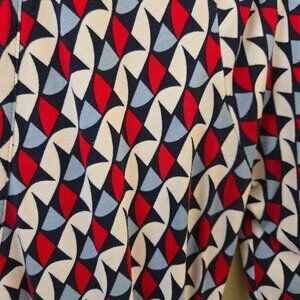 This elegant Boden Elodie wrap dress features a striking red, white, and blue geometric pattern. Its stretch material ensures comfort, making it ideal for career or casual wear. Originally retailed at $140, this midi dress is a stylish addition to any wardrobe.