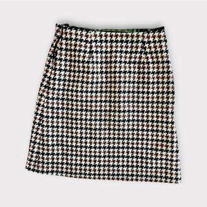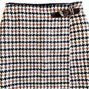 Is it time for a highland fling? This faux wrap skirt brings the traditional Scottish kilt up to date with a subtle A-line shape and stylish wool designs. A real leather buckle on one side keeps it anchored in its Celtic roots. This classic skirt sits at the natural waist and finishes right above the knee. Features a houndstooth pattern in shades of black and burnt orange. Fully lined.