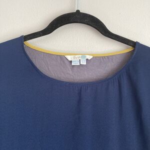 Boden Felicity Mixed Media Long Sleeve Color Block Silky Top Size 6 Artsy. Boden womens Felicity mixed media top. Round neck. Long sleeves. Front pockets. Polyester, viscose and spandex fabric. Navy blue, yellow and gray. Size 6. Measured laying flat: 20.5 inches from pit to pit, 23 inches long from top of tag to hem.