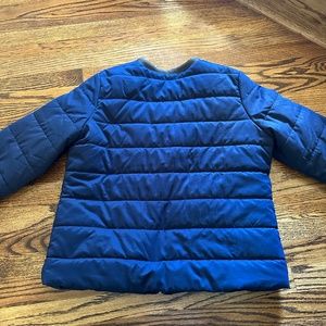Navy blue puffer jacket with brown crossgrain trim on pockets, front, and cuffs. Quilted and fully lined with a cute contrast lining.