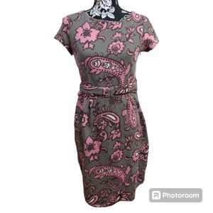 Floral/ Paisley Ponte olive green and pink dress. Mock tie waist. Cap sleeves. Hidden side zipper.