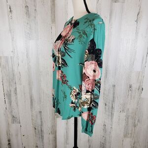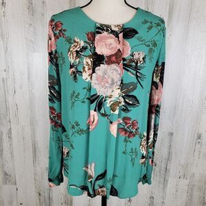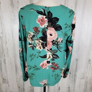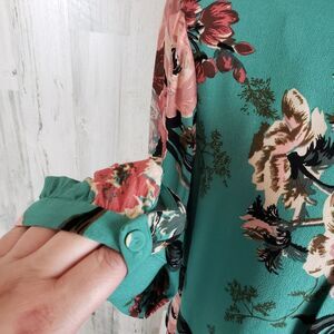 ~ Description: Green, pink and black floral pattern, pleated on front, button details on back, long sleeves, non-stretch, button cuffs