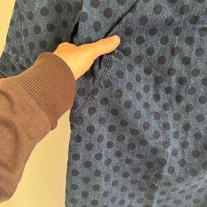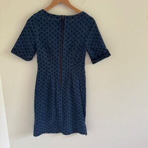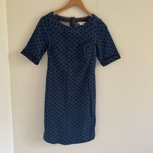 Adorable denim sheath dress. Some stretch to material. Back zip. Polka dot print.