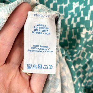* Features: scoop neck, short cap sleeves, gathered waist, pockets, geometric green and cream print, modal/cotton fabric, unlined