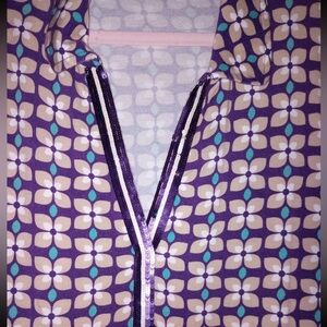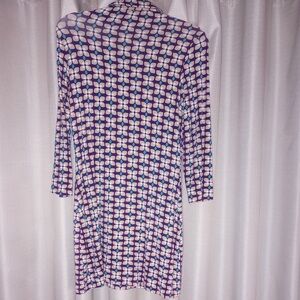 Stylish glitter adorned V-Neck, knee-length Dress with a geometric pattern in purple, cream, and teal. Soft to touch material and 3/4 length sleeves add to the appeal of this dress.