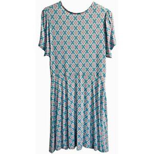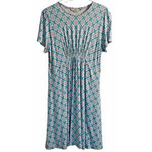 Vibrant geometric jersey dress by Boden in turquoise, pink, and white.