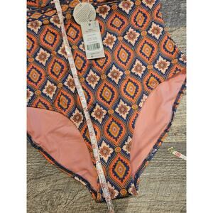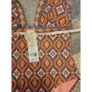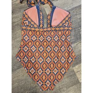 Stylish one-piece swimsuit with a striking, geometric pattern. The contrast of the orange, gold and blue is lovely. Features a halter neck design. Perfect for lounging or splashing at the beach. Simply gorgeous in person - pictures don’t do it justice. Nice material and fully lined. Includes removable cups.