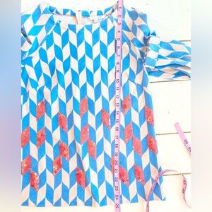 Boden Geometric Print Top Blue & Beige With Pink Sequin Details Size 12 Back Zip