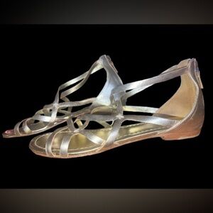 This is a pair of Boden metallic gold Gladiator sandals in gently owned condition. The edge of the heels have light wear. The soles are discolored and marked, but the soles’ leather is intact and has lots of life left. They are a size 39, which converts to a US size 8.