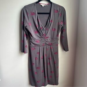 Boden Gray Ruched Sheath Dress with Pink Swans