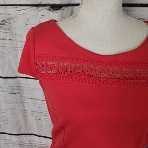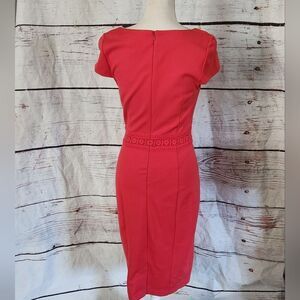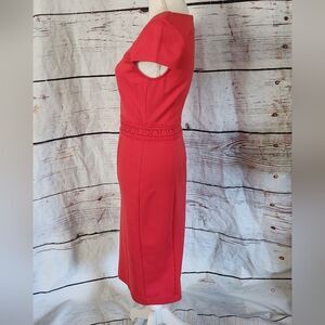 Coral color ponte knit dress with pencil silhouette. Lace insets, hidden back zipper, and fully lined. In very good condition.