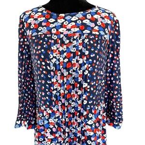 This beautiful Boden dress features a stunning floral pattern in shades of blue, pink, and multi-color. The dress has a round neckline and half puff sleeves with a pleated and button accent. It has a keyhole neck and a button closure. The knee-length shift dress is made of viscose material and is machine washable.