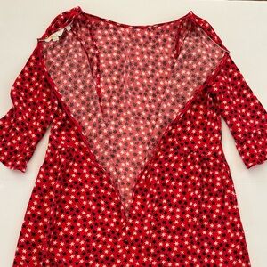 The lightweight dress features a red background with a scattered star pattern in black, white, and red, side pockets, ¾ length sleeves that flare at the cuffs, relaxed fit, concealed back zipper and finishes just above the knee. Perfect for casual outings, 4th of July, Memorial Day. Approximate flat measurements; length 36”, armpit to armpit 20”, sleeve length 16.5”