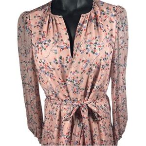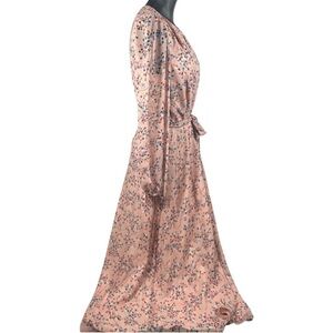 Chic pink silk maxi dress with floral design. Long sleeves and flowing silhouette. Ideal for stylish outings. Belt included!