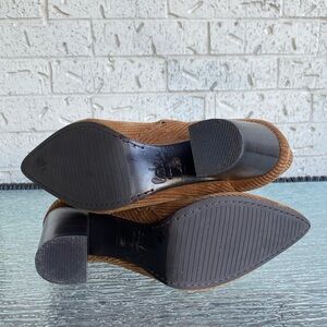 Elegant tan corduroy boots with a sleek heel. Perfect for stylish outings. Leather and corduroy. 3” heel. Size 40 or 9.5 however they fit a 9 nicely.