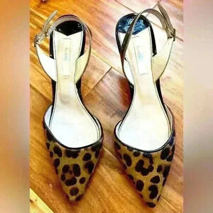 Very nice gently used condition. Very clean inside and out. Leopard print calf hair with 3” black patent heels, silver or pewter patent sling back.