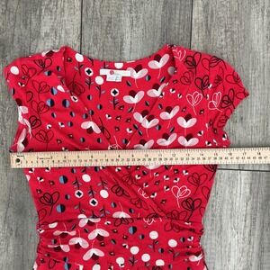 Whimsical charm defines this Boden midi dress, a delightful addition to your wardrobe. The vibrant red canvas showcases a playful floral and heart print, instantly brightening any room you enter. The flattering wrap silhouette gently cinches at the waist, creating an hourglass shape that highlights your curves. The V-neckline adds a touch of elegance, while the short sleeves keep it casual and comfortable. Dress it up with heels for a romantic dinner date, or pair it with sandals for a breezy afternoon picnic. Perfect for a garden party or a weekend brunch, this dress effortlessly combines style and comfort.