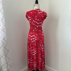 Keywords: Boden dress, red midi dress, floral print dress, wrap dress, cottagecore dress, women's dress, summer dress, casual dress, party dress, v-neck dress, short sleeve dress, boho dress, bohemian dress, petite dress, designer dress