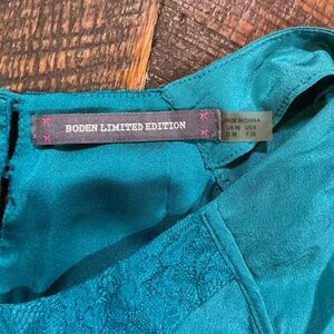 This stunning Boden Limited Edition dress is the perfect blend of elegance and sophistication. Made from a luxe silk blend in a striking teal green shade, it features lace detailing, a fitted silhouette, and quality craftsmanship that Boden is known for. Perfect for weddings, cocktail parties, or special events.