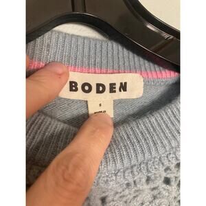 A charming example of modern knitwear with a vintage-inspired spirit, this Boden floral crochet sweater combines a wool-blend yarn with delicate flower accents all in a soft blue pastel. The mid-weight wool blend makes it versatile enough for layering in cooler months. The openwork crochet details lend a handmade feel reminiscent of cottagecore style, while the pleating at shoulders and tailored cut keeps it contemporary and wearable. Perfect for adding texture to a curated wardrobe, this sweater balances playfulness with refinement.
