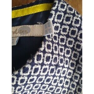 This Boden sheath dress features a geometric MCM print in shades of blue and white. The dress has a scoop neckline, hidden zip closure, and a cinched waist for a flattering fit. It is made from a wool-cotton blend fabric that is lightweight and perfect for all seasons. The dress is lined and has no sleeves, making it ideal for layering or wearing on its own.