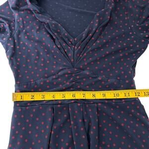 Boden Marion Jersey Knit 3/4 Sleeve Gathered Dress in Polka Dot Print Navy/Red. In excellent used condition. Features a v-neckline with gathers/pleats on the chest, 3/4 length sleeves, and a jersey knit construction. Mini length, hits above the knee.