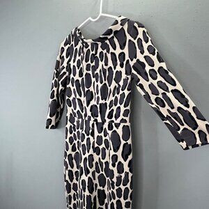 Boden Marisa leopard print sheath dress in beige with black and gray spots. Back zipper, 3/4 sleeves, fully lined, good condition. Size 4.