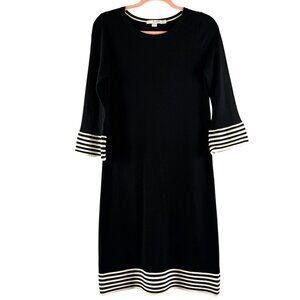 Hit all the right notes in this stylish shift dress, complete with bell sleeves. A flattering fit and striking stripes along the hem and cuffs. You'll make a sophisticated impression, whether you wear it to work or your next dinner date. Excellent pre-loved condition.