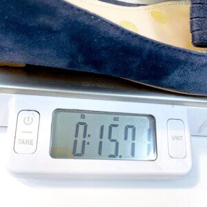 Gorgeous suede low heel loafers in navy blue with kelly green fringe.