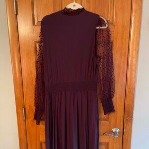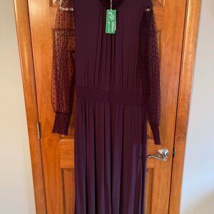 Bought for an event that didn't happen. Beautiful eggplant color dress, sheer sleeves, elastic waist, NWT. Great Boden style. Never worn. Smokefree home.