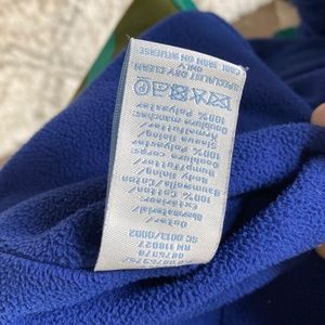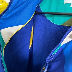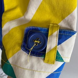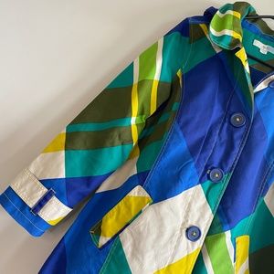 Vibrant plaid design. Features blue, green, yellow, and white. Stylish button closure. Hooded for extra warmth.