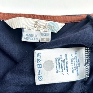 This Must Have Tunic Mini Dress from Boden in Navy Blue with a rust color bird print is versatile and easygoing. It features a scoop neck, 3/4 sleeves, and gathers at the waist to make it extra flattering. Flattering fitted shape through bust and waist. Empire line waist, 3/4 sleeves. Long enough to wear as a dress for many. 95% viscose 5% elastane Machine washable Item WL772