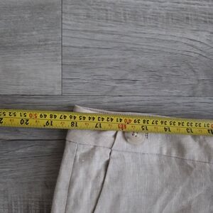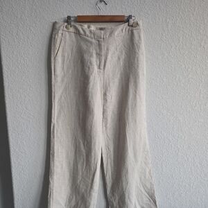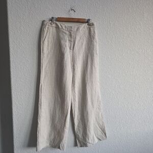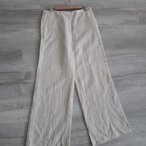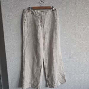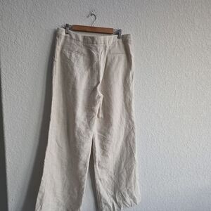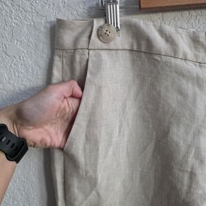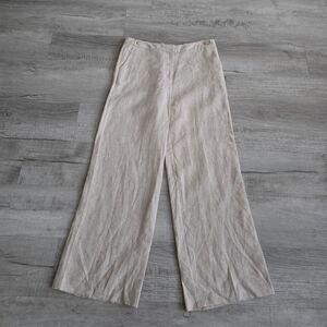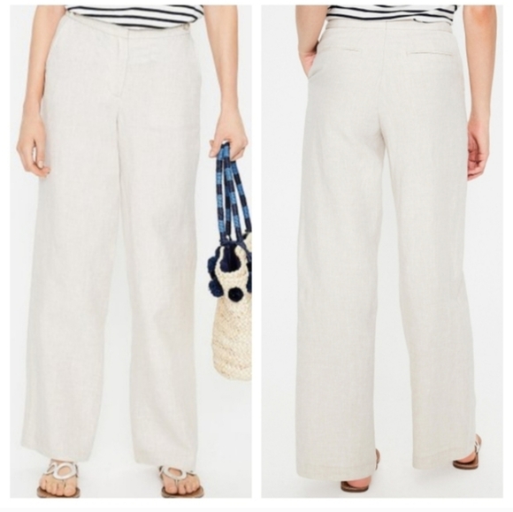 These are made of 100% linen feature a wide-leg cut, front slant pockets, and back welt pockets.