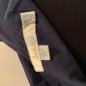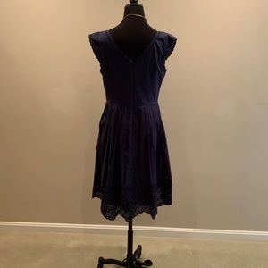 Perfect little summer dress, navy blue cotton with eyelet detail at the neckline and along the hem. Classic style, sleeveless, soft pleats in the skirt, back zip. Made by Boden, size 10. Worn less than a handful of times, great condition.