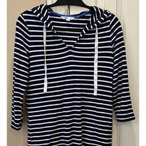 Boden Navy & White Striped Imelda Hooded Jersey Tunic Dress with pockets UK 8 US size 4 gently used smoke free home. clean. pit to pit 19 inches top to bottom 32 inches.