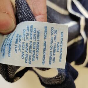 Boden Navy & White Striped Mini Skirt Size 8L. In excellent used condition. Cotton blend material. Baby blue z& white striped pattern throughout. Features a zipper fly with button closure, & belt loops. Two side hand pockets. Would pair well with a white polo, tucked in & belted with wedge heels in a neutral shade.