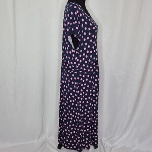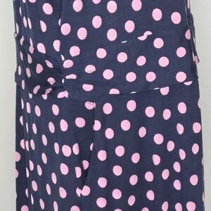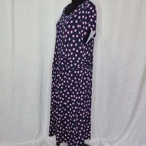 Chic Boden midi dress. Navy base with pink polka dots. Short sleeves. Perfect for any occasion.