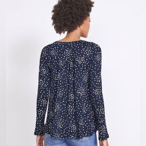 Chic navy blouse with white and gold polka dots. Button-up front. Ideal for casual wear.