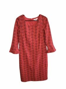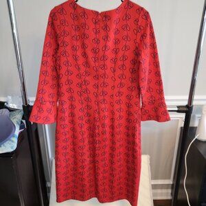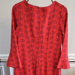 The Boden Newlyn Climbing Vine Jersey Jacquard Dress is a shift dress with a wide neckline and three-quarter length flared or "fluted" sleeves. The dress is made from a textured jersey fabric, often a blend of cotton and polyester, and has a concealed back zip. Gorgeous true red and navy dress.