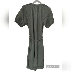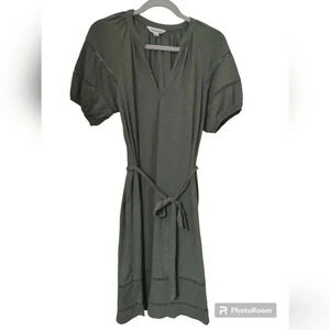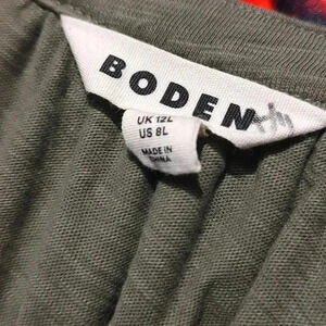 Chic olive midi dress by Boden. Features a V-neck and belted waist. Ideal for versatile styling.