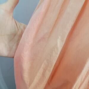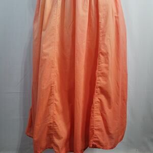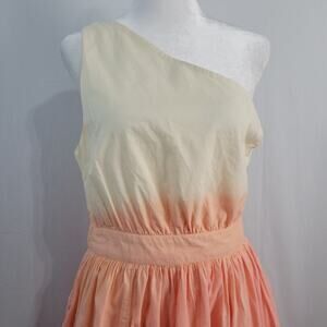Boden Ora One Shoulder Midi Dress in an ombre cream to coral color pattern. It is a lightweight cotton. It is lined. There are pockets. There is a zipper closure at the left. There are no inner hanger straps. The hook on the hook and eye above the zipper is missing. There is an area of fabric around the zipper that seems discolored. I'm not sure if this is a manufacturing flaw from the coloring process or of it somehow became discolored from use. This can be seen in the last photo.