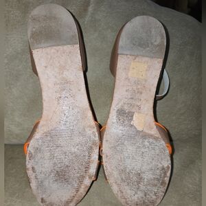 Step out in style with these chic brown and orange sandals. Perfect for any occasion, these shoes offer both comfort and elegance.